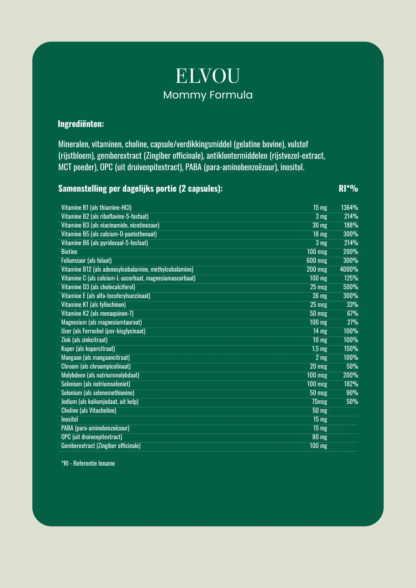 De Mommy Formula bevat alle belangrijke micronutriënten voor de preconceptiefase, zwangerschap, in verantwoorde, goed opneembare vormen. Denk aan bioactieve B-vitaminen, natuurlijk vitamine D3, ijzer in bisglycinaatvorm, gecoate vitamine K2, en choline. Uniek is de toevoeging van een flinke dosis gestandaardiseerd gemberextract. Deze formule mag voor de zwangerschap, tijdens de zwangerschap en tijdens het geven van borstvoeding!